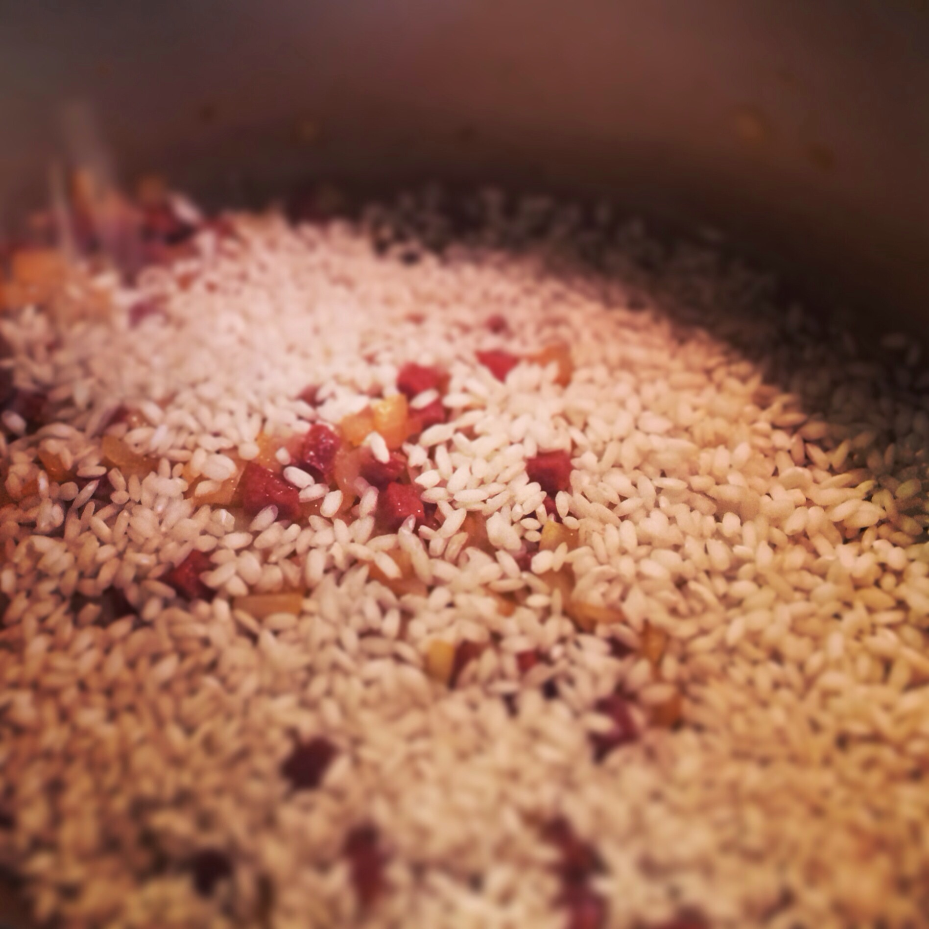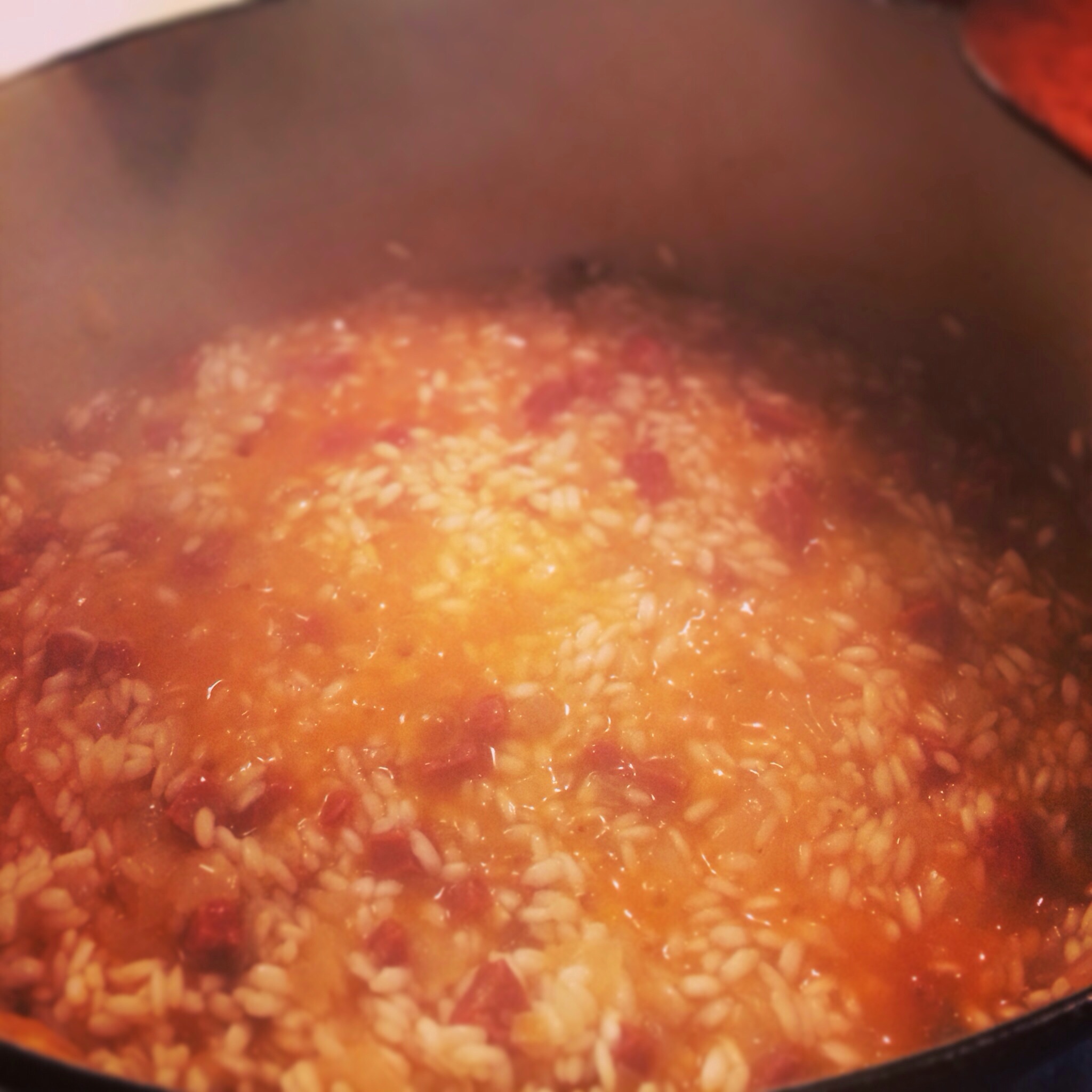 There are so many many variations on an excellent theme with risotto, this is by no means the king but it’s good midweek doesn’t need really any special ingredients, quite basic and you can use up the chorizo you might have left from Spanish Omelette. Will show you some other goodies later like wild mushroom, smoked haddock and poached egg etc.