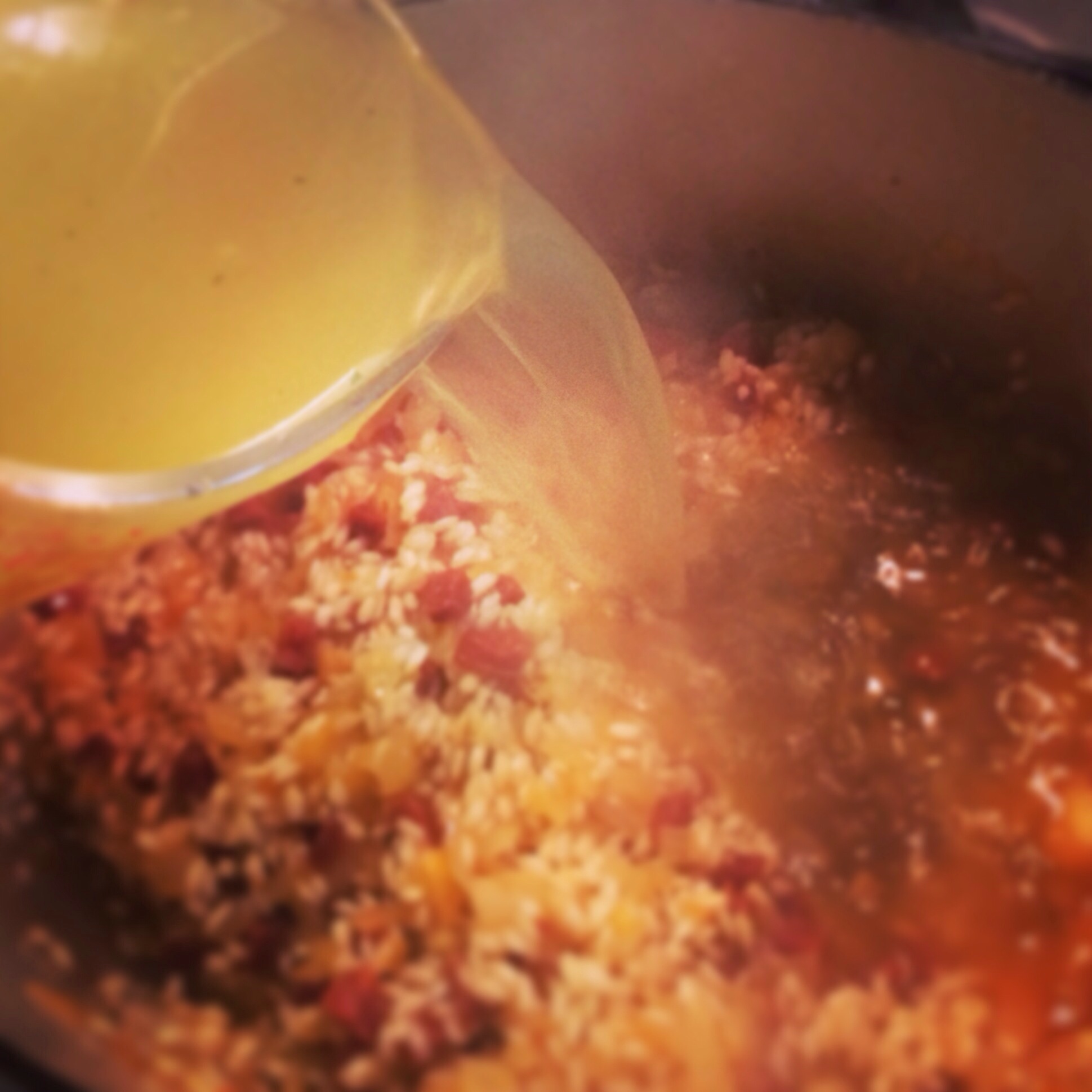Step 3 – Make your chicken stock in a measuring jug and begin to add to the rice bit by bit until it gets absorbed gradually.