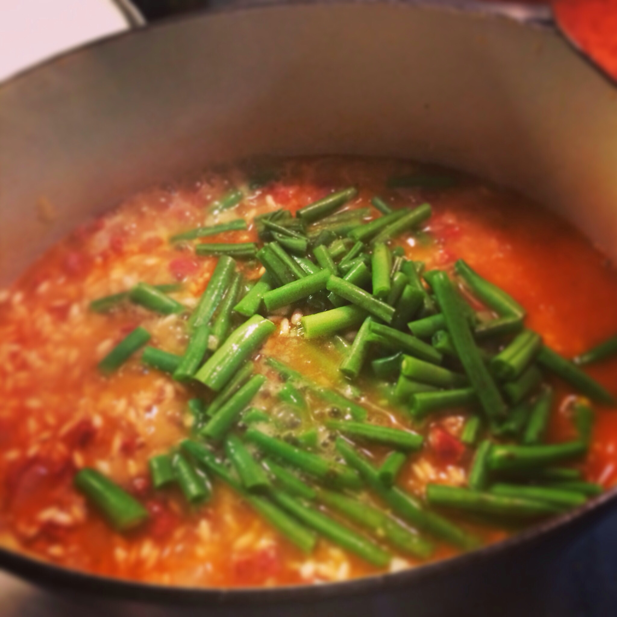 Step 4 – Keep adding stock and stirring genius. Until the rice is nearly cooked. Chop the green beans into bits and add raw is fine, allow to cook in stock.