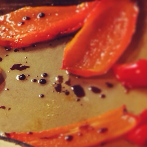 Step 2 – Pour in a big splash of wine and allow to bubble and cook off a little. You guessed it, stir. Chop the peppers and put on a baking tray with the cherry tomatoes, drizzle with oil and balsamic vinegar and put in the oven at 180c.br />