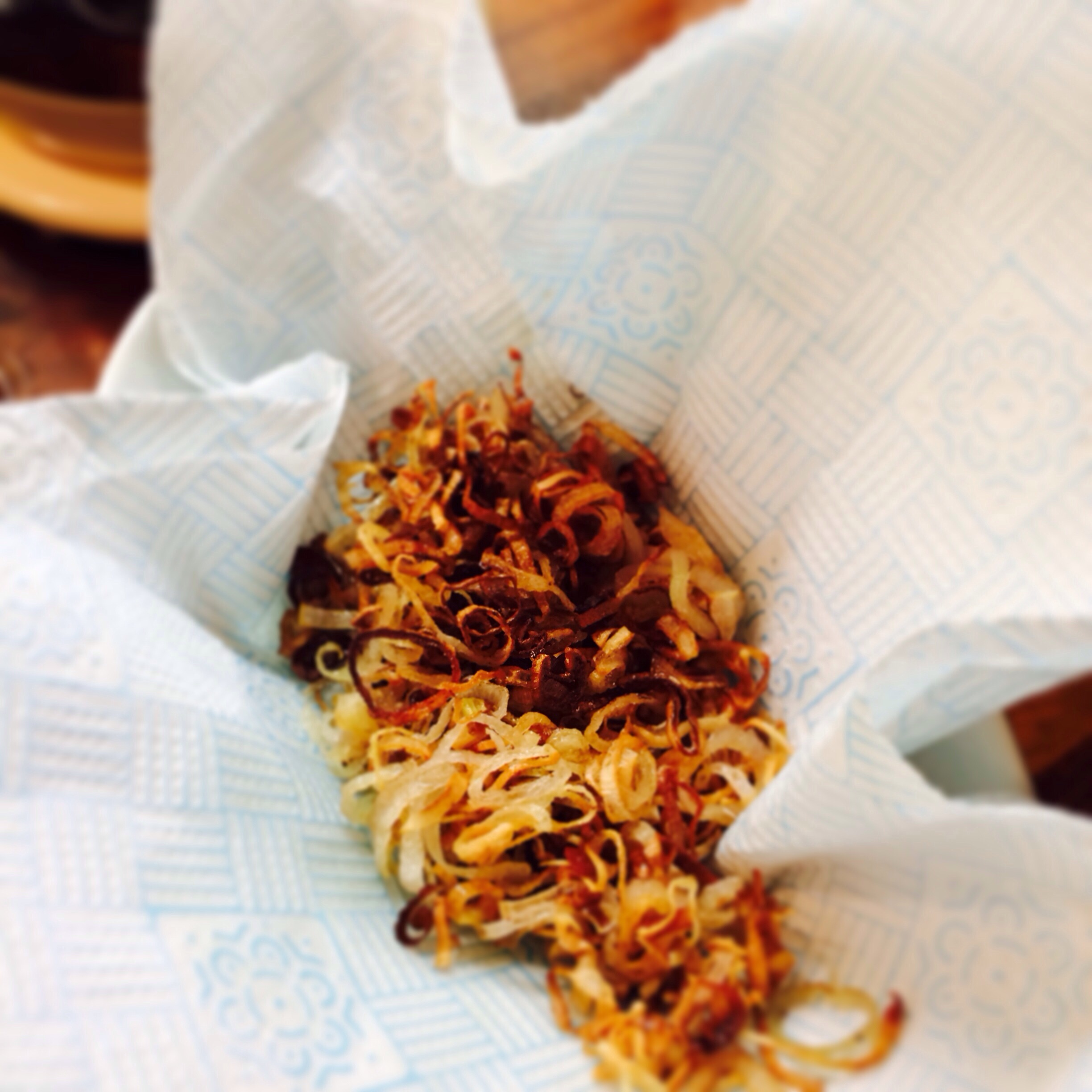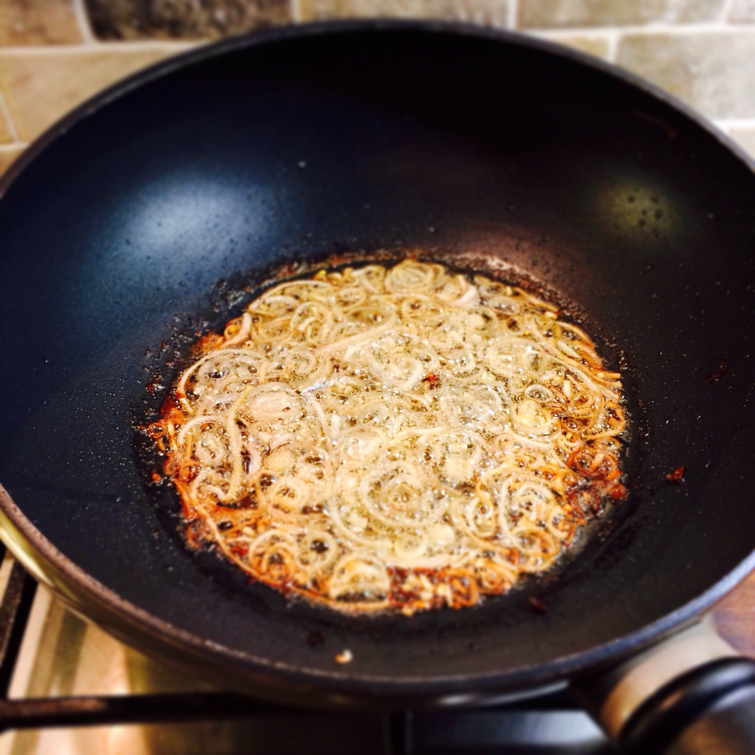 2 – Next heat approx 0.5 inches of sunflower or vegetable oil in the bottom of a wok until very hot. Add the finely chopped shallots bit by bit. They should begin to brown evenly. When they do remove them from the oil and allow to dry out and crisp up on kitchen paper.