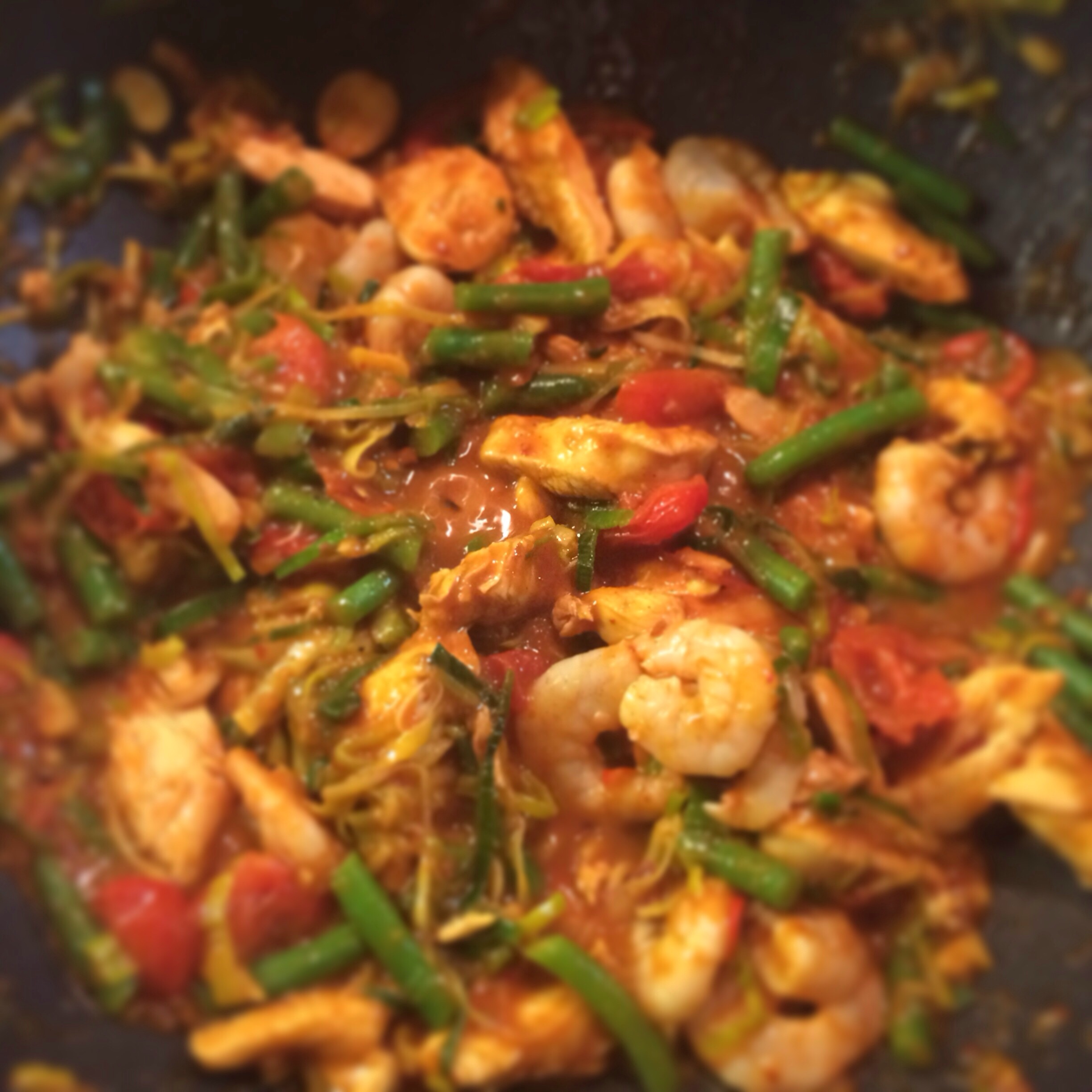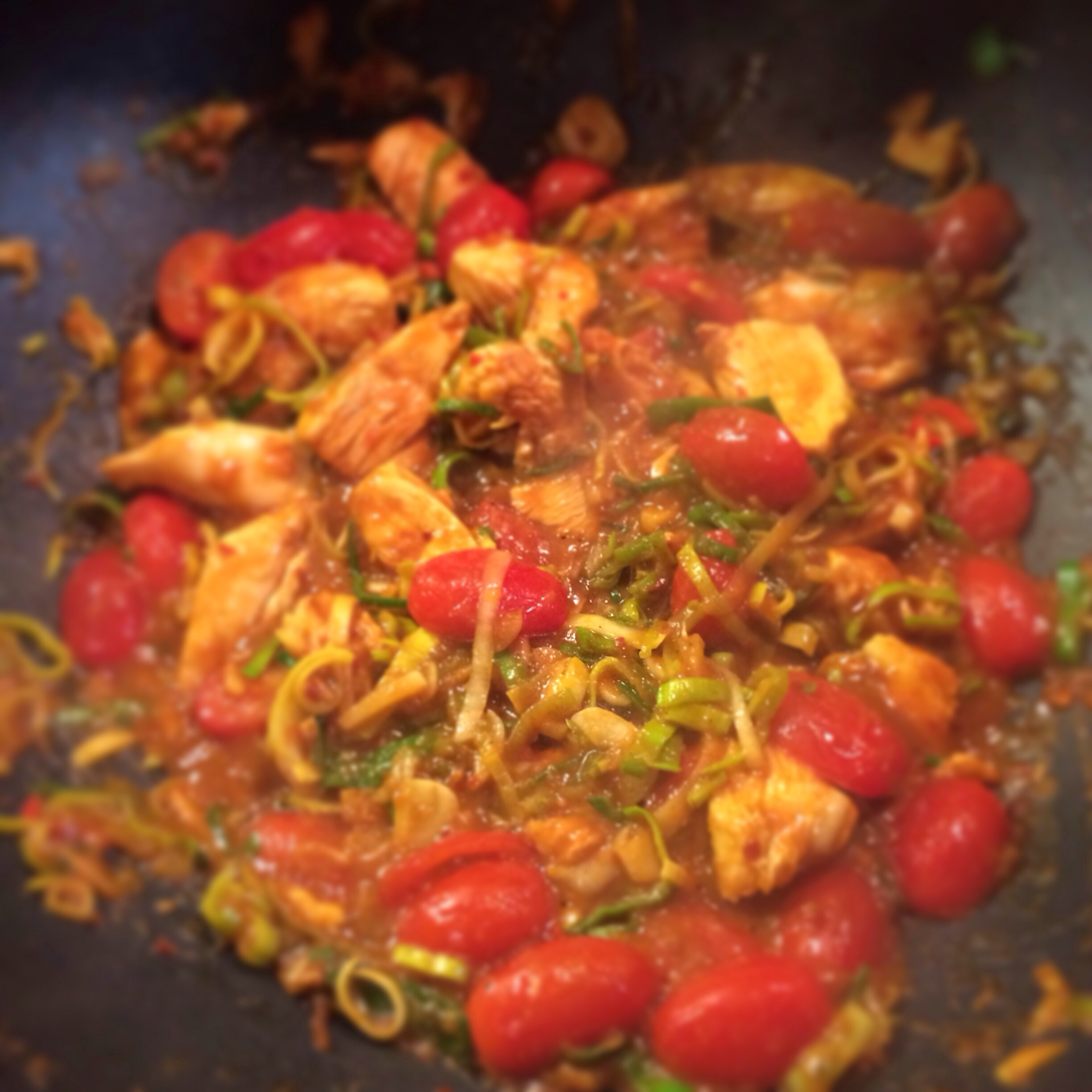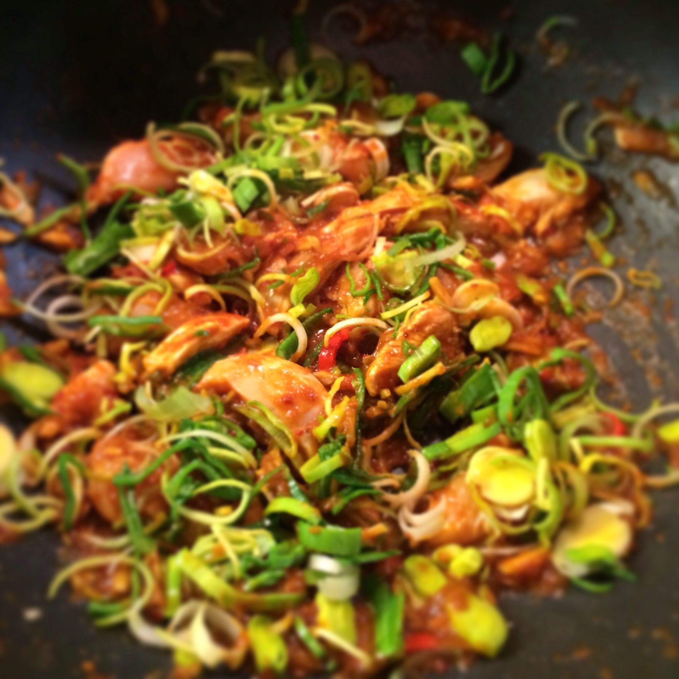 3 – When all the shallots are done discard the oil from the wok (not down the sink or you will block it bozo) pour into a jar or bottle you were going to bin/recycle then throw away. Heat a small amount of sesame or peanut oil (any oil is actually fine) then add the paste, most of the chilli, garlic and ginger allow to cool for a minute or two. Chop the chicken breasts and add with the chopped leek.