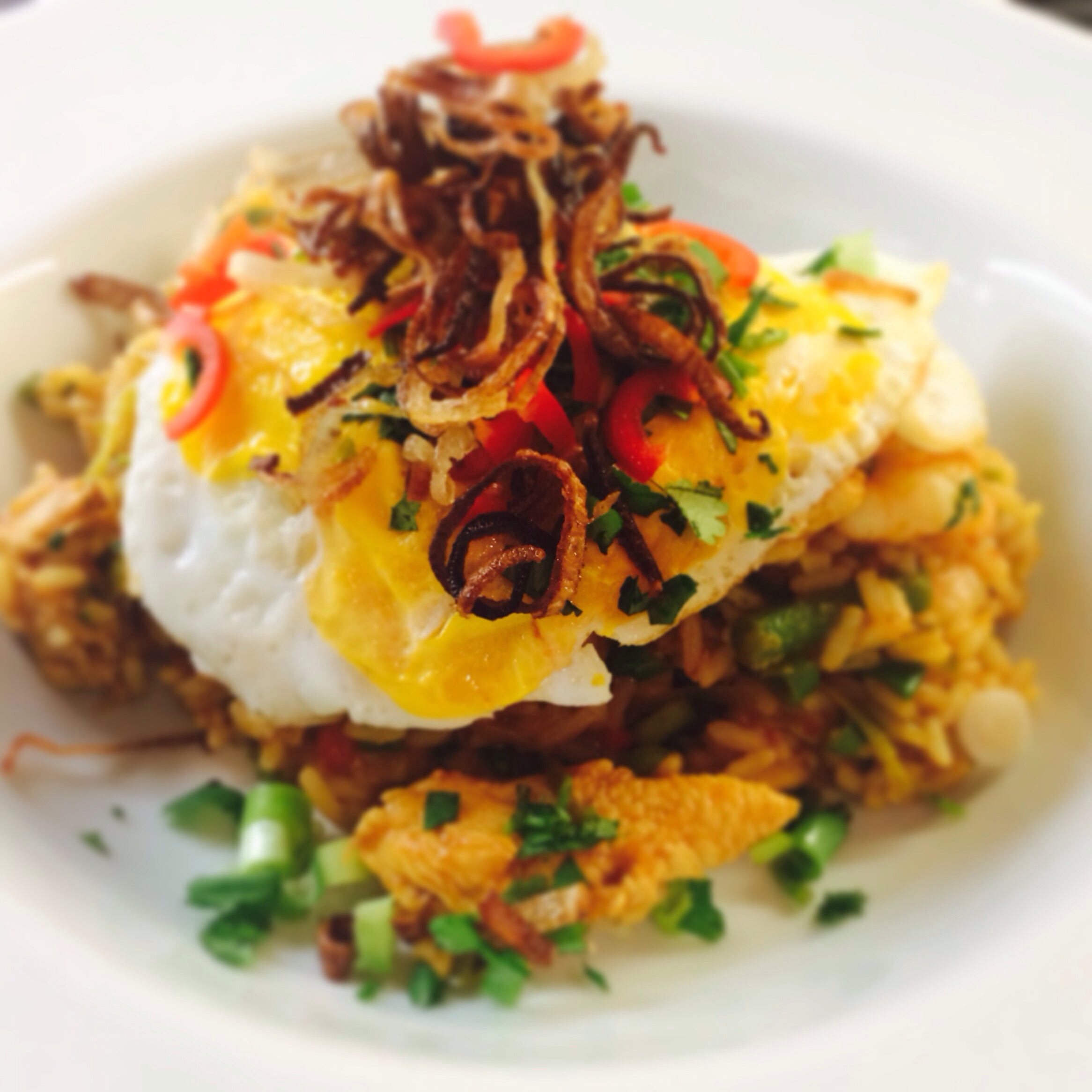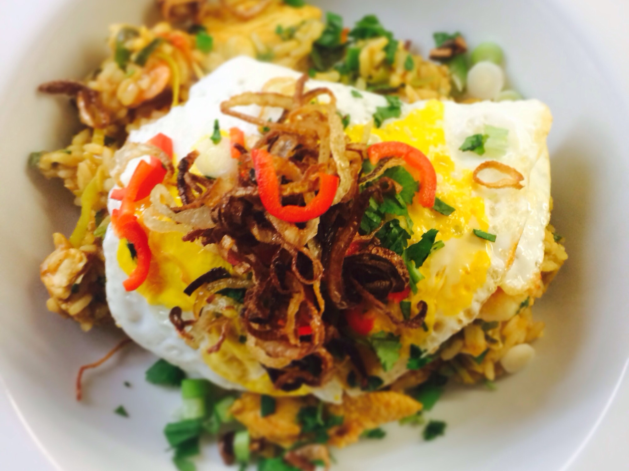 7 – You are READY to Goreng. Divide your rice between your warmed bowls/plates. Put a fried egg on each and garnish with any left over coriander, spring onions, red chilli and get the crispy shallots on the top.