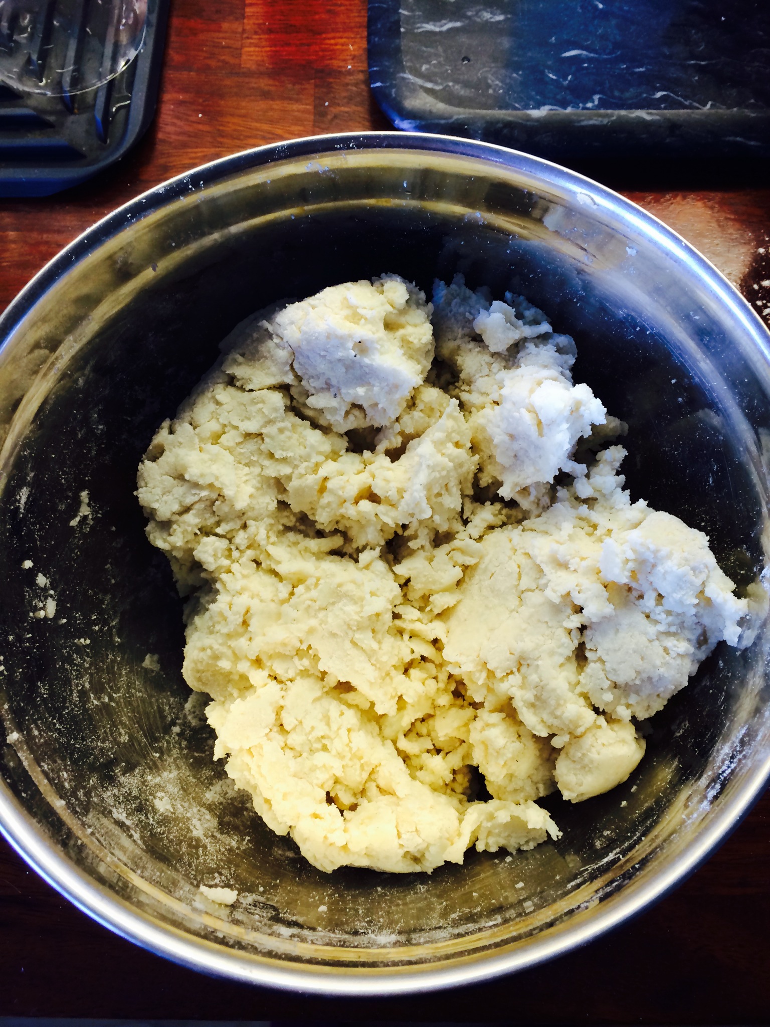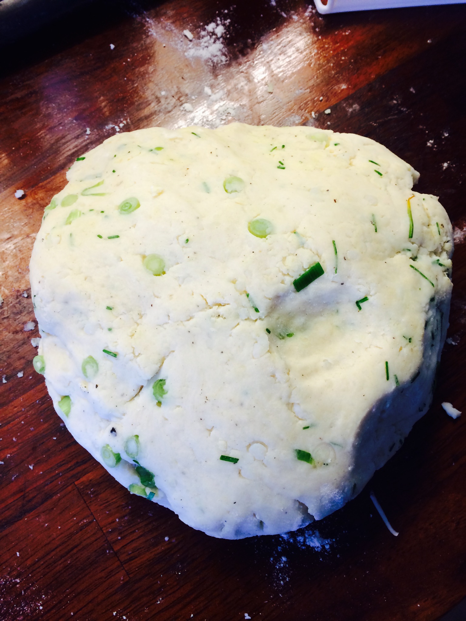 1 Put mash into a bowl, sieve in the flour and squish and knead together to make a dough (you might need the butter to combine it) add flavourings if you like eg big handful if cheese, chives, spring onions etc. Roll out with a rolling pin flat – 0.5cm if you can get it that thin you will need to sprinkle flour into worktop to stop it sticking.