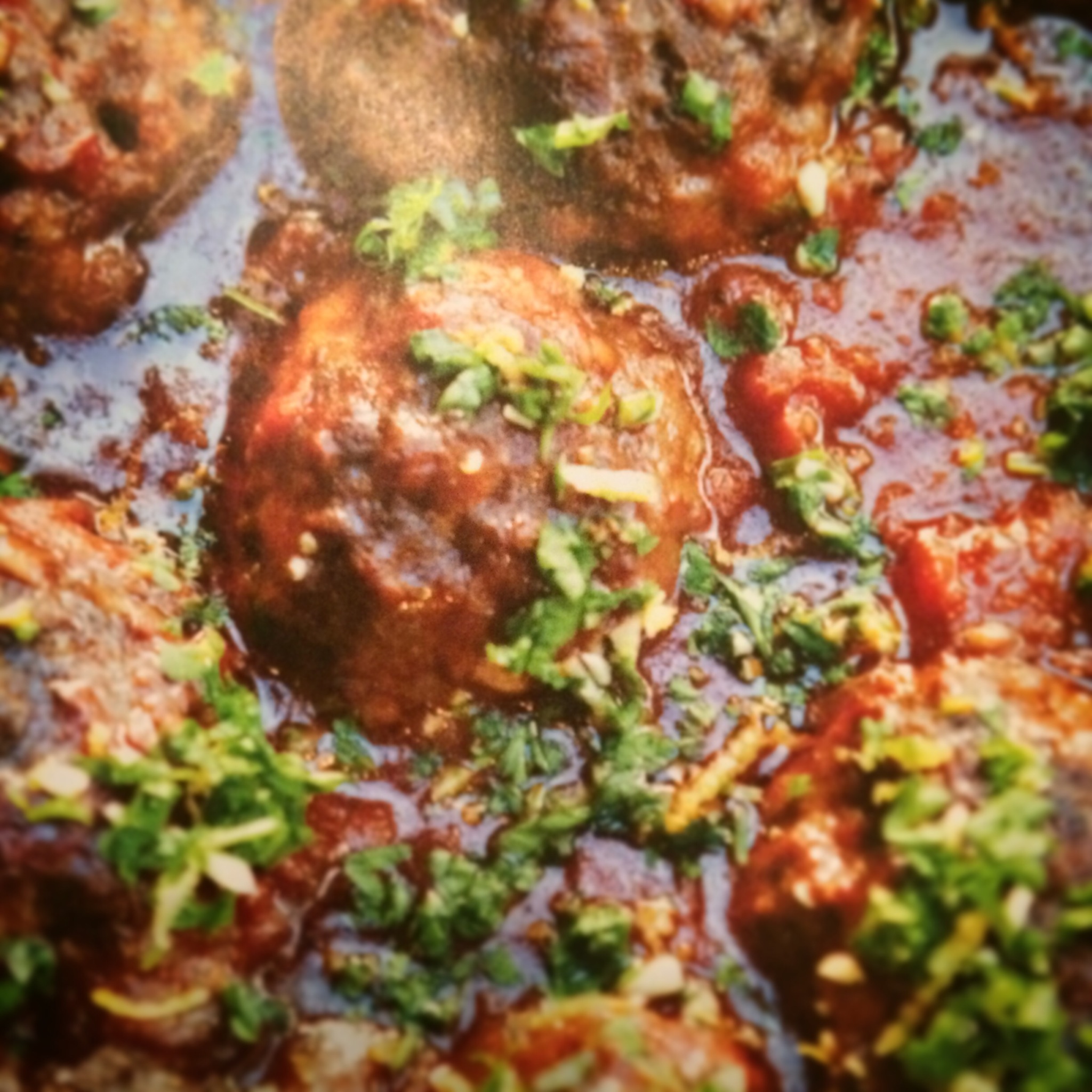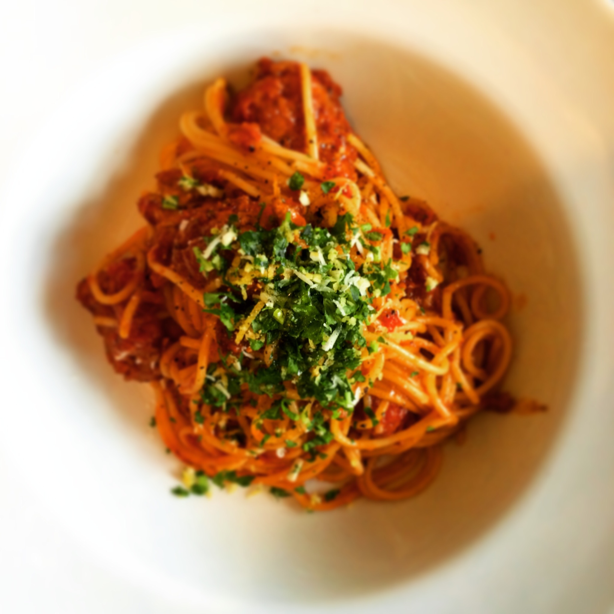 6. Just before serving make the Gremolata. Super finely chop the garlic and parsley and mix with the grated lemon zest. Scatter the meatballs with this a good lug of extra virgin olive oil and Parmesan.