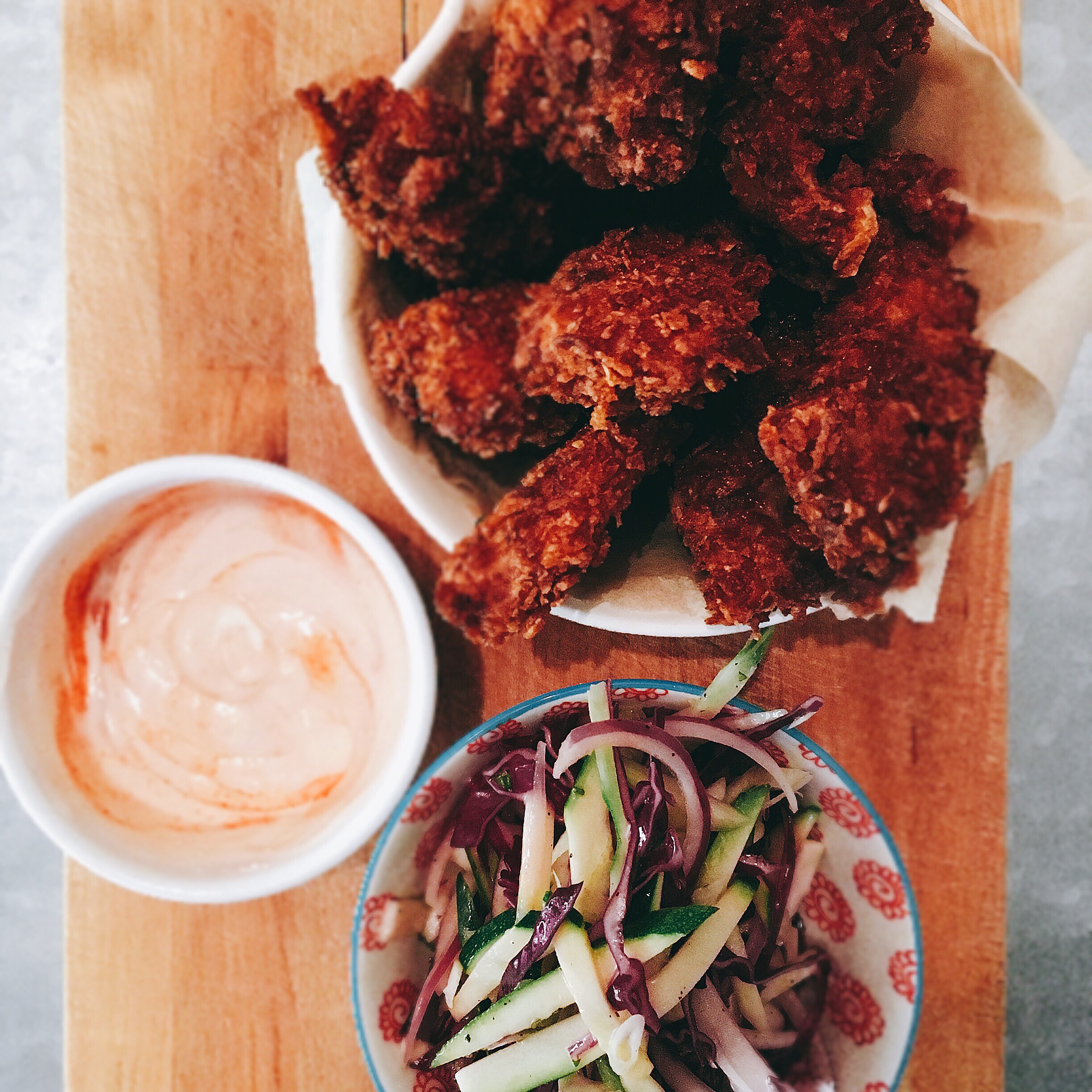 - Serve with slaw and yogurt with Sriracha stirred through. Literally you will never eat anything else.