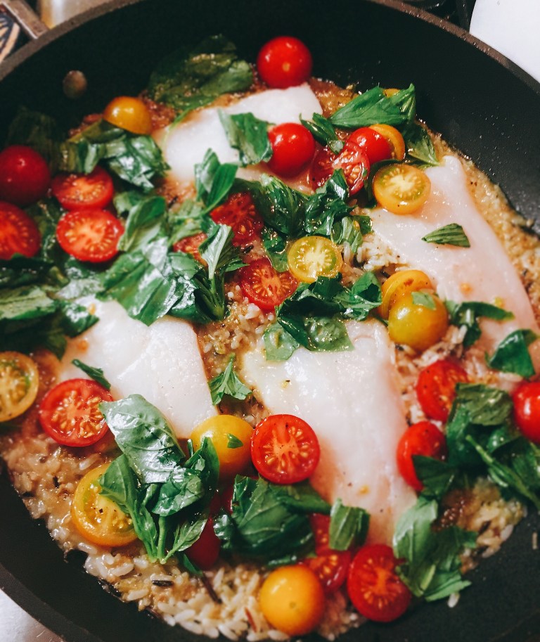 - Nestle the fish into the rice and add the tomato mix. Leave to cook for 10 mins. Then remove the lid and allow liquid to evaporate.
